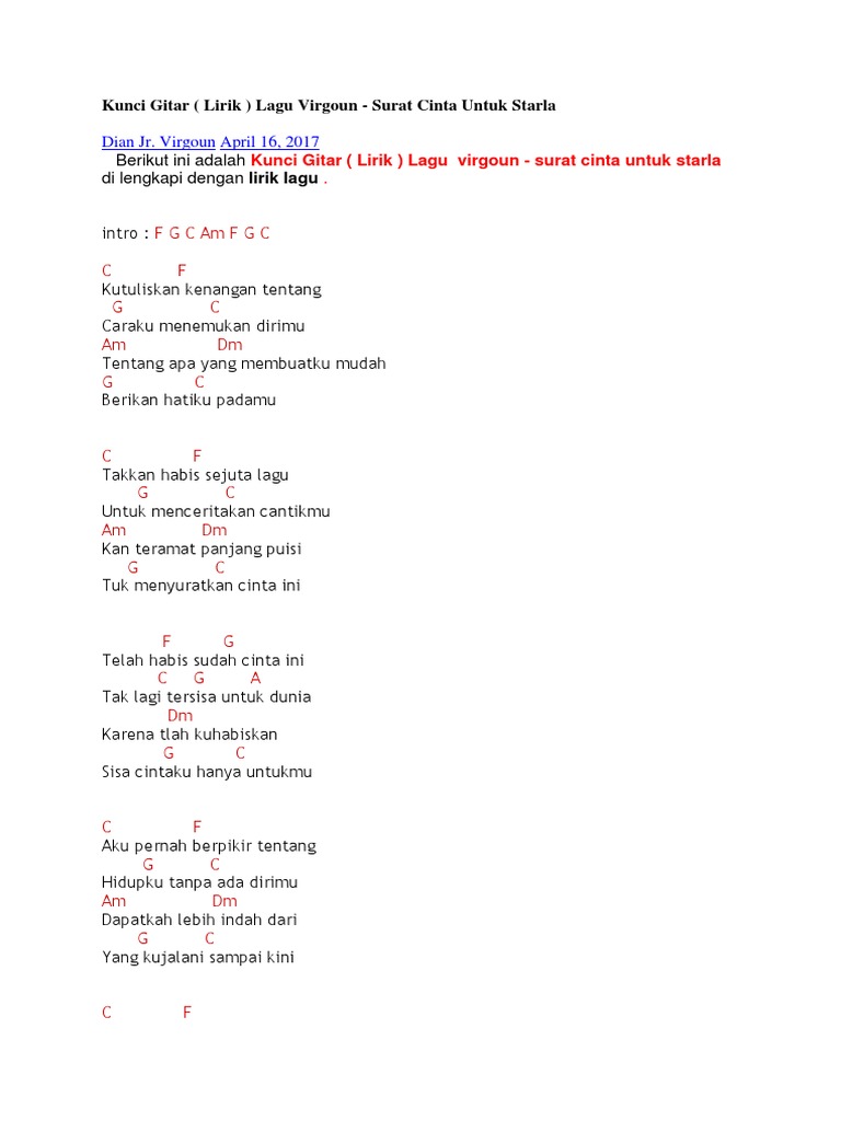 Oh Tuhan G Am G Tuhan tolong aku F Em Dm G Katakan padanya aku cinta Intro. Chord Lagu Tunggulah Kasih - Zidan feat Tri Suaka. Intro C D Em D C D G G G Menatap langit yang kan menjelang Em Sinarnya yang tak akan pernah hilang Am Setelah lewati penantian panjang C D Yang tak berujung dan terus meradang G Kini tiba waktu yang dinanti Em Sudah lama saling pahami hati Am Satu.